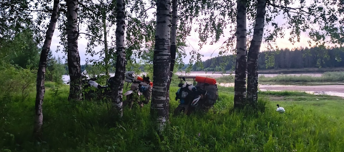 Ничего нет хуже битого асфальта. Так я еду еще примерно 60 км. Начинается участок с бетонными плитами, справа от которых накатана грунтовка. Еду именно по ней, стало полегче. Периодически выезжаю на большие перекрестки, указателей нет, но продолжаю движения ориентируясь на знаки главной дороги. Закрадывается волнение и подозрение, что дорога какая-то странная. Еду дальше, придерживаясь логике двигаться по главной дороге. На горизонте появляется большая песочная насыпь, ведущая к реке. Это река Вашка, большая и красивая. Указатель на село Важгорт. Тут ходит паром, но время примерно 21:00, вокруг ни души, на берегу стоит пустой трактор и пассажирский автобус. «Это я точно не туда приехал», – растерянно вздыхаю. По насыпи подъезжаю к самой реке. Смотрю на одометр. 151км. Думаю, хватило бы на обратную дорогу. Пытаюсь развернуться, радиуса не хватает и у края обрыва мотоцикл начинает вязнуть в песке. Боюсь, что на ходу могу тут зарыться по самое «не балуйся». Кладу мотоцикл на бок и пытаюсь подтащить к центру, а потом поднять.