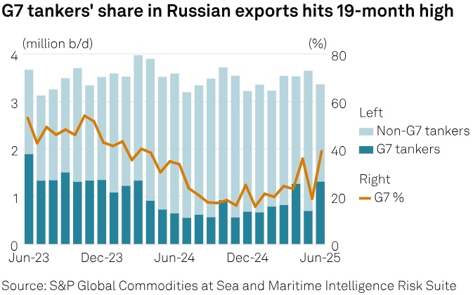 В прошлом месяце Россия увеличила долю своего морского экспорта сырой нефти на танкерах, использующих услуги G7, до самого высокого уровня с конца 2023 года, чему способствовало возвращение греческих операторов, которые продемонстрировали растущую уверенность в маневрировании в рамках западных санкционных схем.