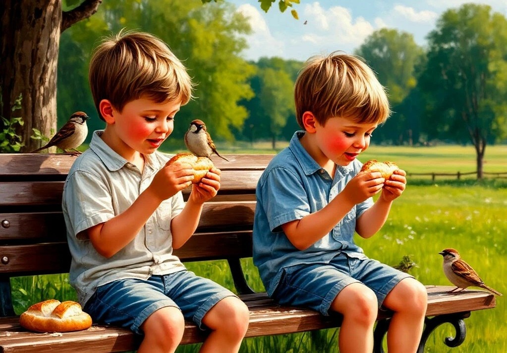 Вася сидел на лавочке возле своего подъезда и о чём-то сосредоточенно размышлял. Рядышком стоял пакет со всякой всячиной из продуктового магазина. Вася его сторожил (пакет, а не магазин), мама попросила. Он сидел в закрытой позе, как-то даже по-взрослому: нога на ногу, скрещенные на груди руки, нахмуренные брови, серьёзный взгляд. Прямо у ног мальчика прыгали юркие коричнево-серенькие птички, характерные обитатели наших широт. Одна из них всё норовила забраться внутрь пакета. Васе очень хотелось покормить воробьишек, но он боялся, что мама заругает. Подбежал Санька Митяев. — Привет, Вась! О, что это тут у тебя? — он бесцеремонно порылся в пакете, достал батон и с хрустом откусил горбушку. — М-м-м… Вася хотел было ответить на приветствие друга, но тут у него в голове как будто бы загорелась лампочка, и он молча отвернулся. Санька пожал плечами, дожевал горбушку и положил батон обратно в пакет. — Схожу домой. Пить охота. Прошло ровно две минуты. — Васёк! — крикнул Санька, спрыгнув с крыл