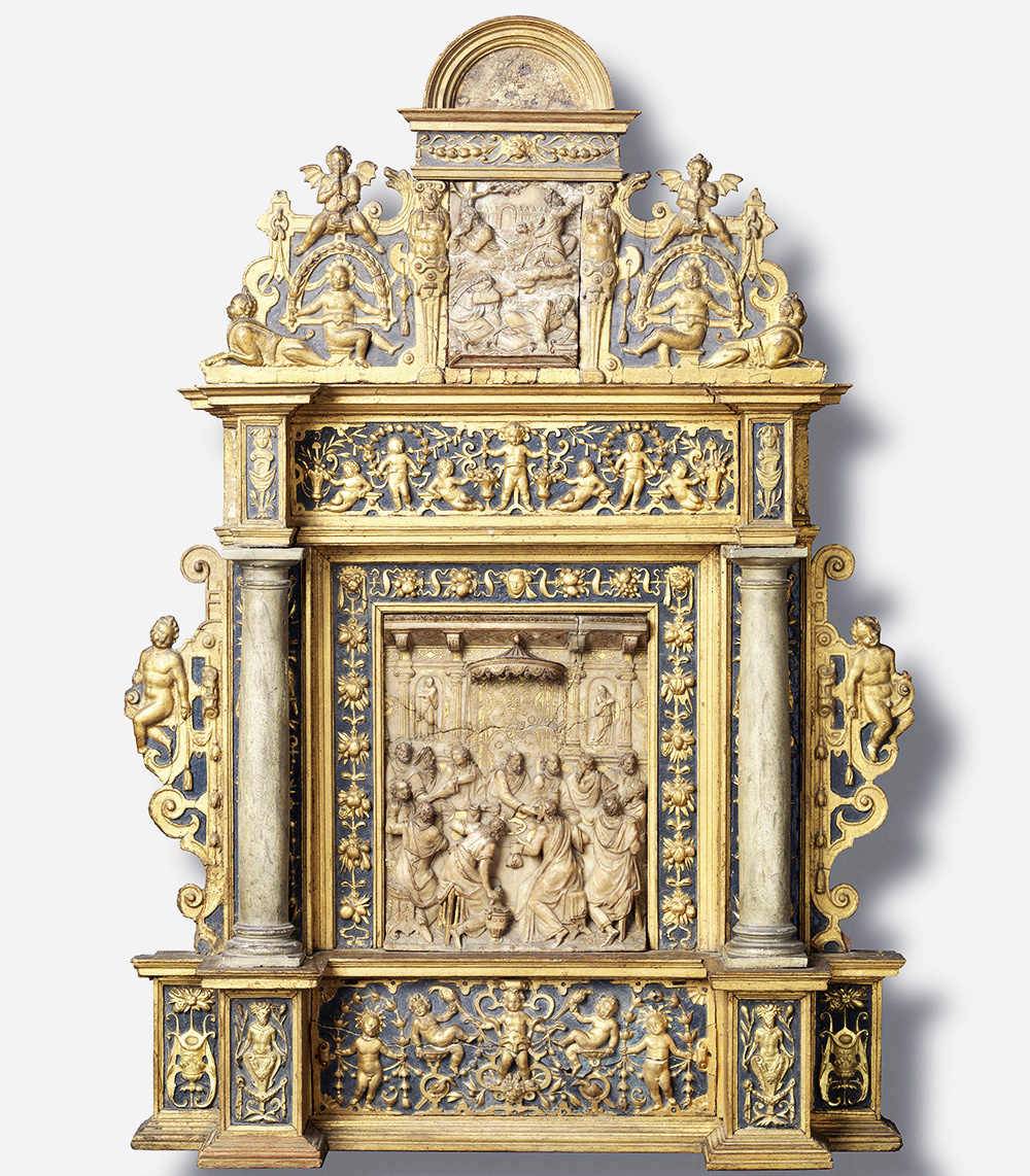 В центре этого домашнего алтаря – Иисус, принимающий последнюю трапезу с апостолами в ночь перед распятием. Сюжет изображён очень точно и вырезан из мягкого алебастра. Материал не тот, что кажется: деревянные колонны покрыты краской под "мрамор". Рельефные украшения из штукатурки окрашены в тёмно-синий и золотой цвета. Украшения сделаны в "стиле Флорис" (Корнелис Флорис – антверпенский скульптор-архитектор). Алебастр прекрасно подходит для создания изящных драпировок и узких ремешков. В XVI веке алебастр добывался в разных местах Европы. Этот был добыт в Англии. На данном алтаре Иуда держит в руке мешочек с деньгами. Это мешок с серебряными монетами, которые он получил от римлян за предательство Иисуса. Иисус изображён в центре, под старинным балдахином с позолоченными украшениями. Иоанн, его младший ученик, единственный безбородый. Он сидит справа от Иисуса, на "хорошей" стороне. Иисус и его последователи вместе совершают свою последнюю трапезу. С высоты птичьего полёта мы видим