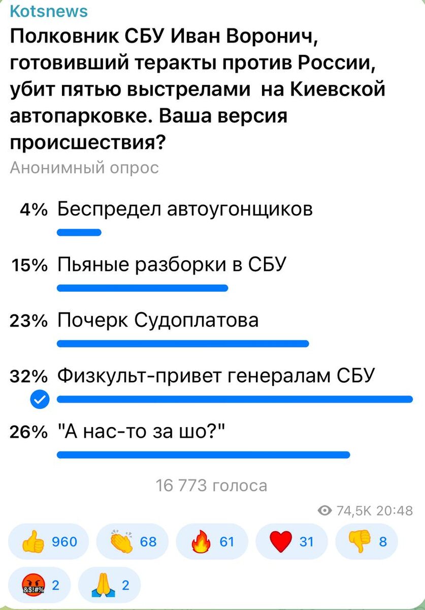 ⚡️⚡️⚡️ 32 процента подписчиков считают, что ликвидация Воронича - тонкий намек генералам СБУ. Нехай не расслабляют булки.
