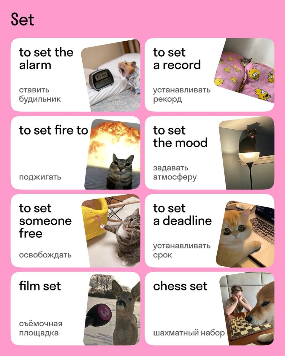 Set, go, take и их разные значения ✍️ Признаемся, английский не всегда поддаётся логике. Иногда одно слово имеет десятки смыслов: ♟️ Set может быть съёмочной площадкой или шахматным набором. 🚨 Go может описать нервный срыв или звук сигнализации. 📸 Take используют, когда хотят сделать фото или не торопиться. Собрали в шпаргалке самые популярные выражения с этими многозначными словами, чтобы вам не приходилось гуглить их каждый раз. 🎁 Ещё больше полезностей — в бесплатном English Box Приготовили всё самое полезное: • план по выходу на новый уровень; • фразы для прокачки английского; • инструменты, чтобы наконец начать говорить. Забирайте бокс → https://go.skyeng.ru/11box07tg