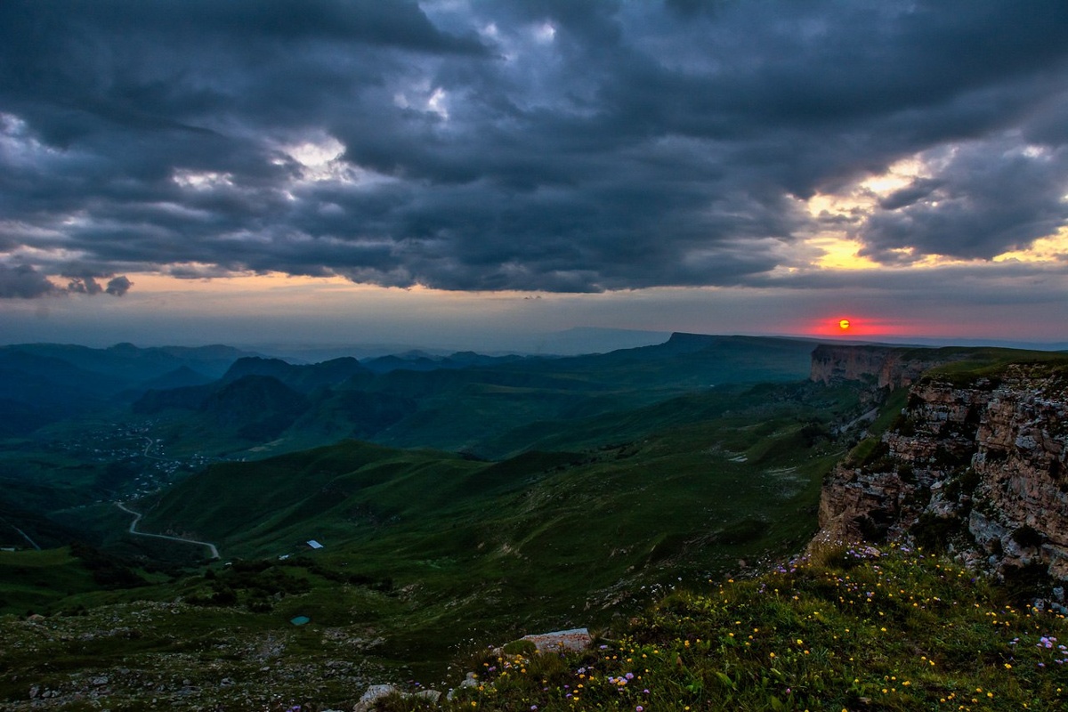 И снова закат на Гум-Баши :) А вы такое уже видели? Эльбрус в этот раз не показывали, но виды с вершины Гум-Баши открывались невероятные. Красный закат, круг солнца, просвечивающий сквозь закатную дымку, медленно уходил за горизонт. И эти колдунские облака, висящие чуть выше головы - будь стремянка, пожалуй, и достал бы :)