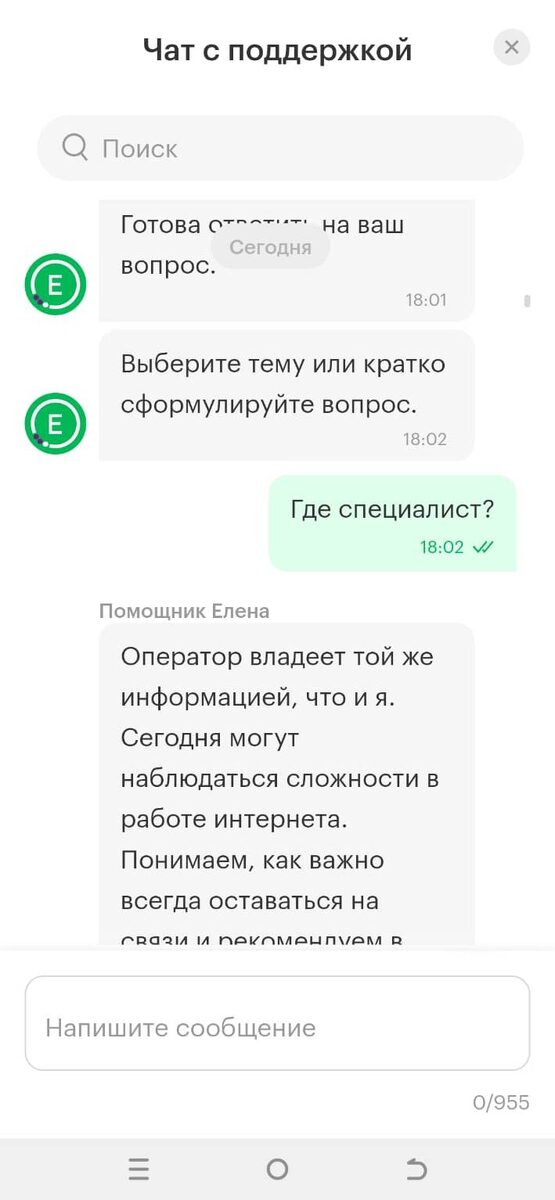 Вот как можно поступить: Если вам неинтересно смотреть картинки переписки, можете сразу пролистать до конца статьи. Но я кратко покажу несколько скриншотов общения сначала с ботом Еленой, а потом со специалистом. Итог будет на последних трех картинках. Я пыталась связаться с оператором в течение полутора часов. Мне нужно было много раз повторять фразу «Связь со специалистом», потому что бот Елена задавала мне вопросы. Каждый раз, когда бот сбрасывал звонок, я набирала номер снова. В конце концов, я смогла дозвониться до оператора. Но она не смогла мне помочь и сказала, что передала моё обращение. Итог на последних трёх картинках. Чтобы дозвониться до оператора, нужно повторять слова «Связь с оператором». А чтобы в чате написать «Позвони мне». Мне интересно: зачем нам такая связь, если в трудную минуту нужно потратить много нервов и полдня, чтобы просто поговорить со специалистом? И даже тогда он, скорее всего, передаст ваше обращение в другой отдел, а не решит проблему сразу, либо вооб