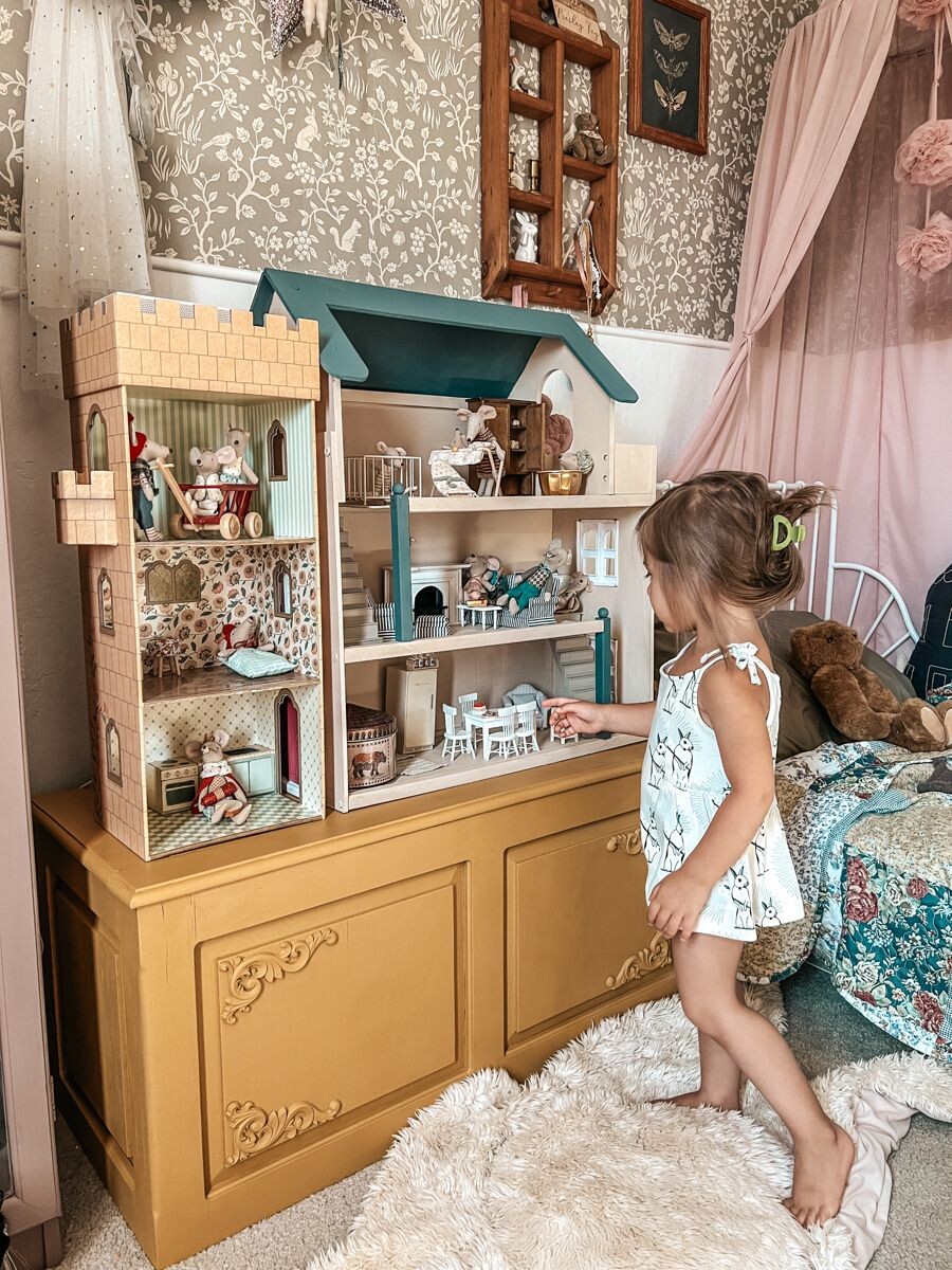 Если у ребенка уже есть стеллаж с игрушками, можно преобразовать его в кукольный домик. Это вариант для более старших детей, которые могут самостоятельно организовать и декорировать пространство. Стеллажи с открытыми полками идеально подходят для создания нескольких этажей, а разделение на секции поможет сделать разные комнаты.