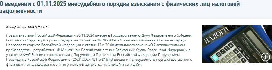 Для тех, кто не в курсе, докладываю: с 1 ноября сего годы будет введён закон, который позволяет ВНЕСУДЕБНОЕ взыскание для налоговой.
