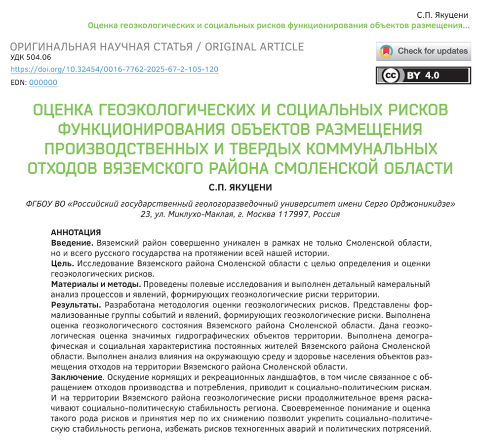 В журнале «Известия высших учебных заведений. Геология и разведка», 2025;67(2), стр. 105—120, опубликована моя статья «Оценка геоэкологических и социальных рисков функционирования объектов размещения производственных и твердых коммунальных отходов Вяземского района Смоленской области».