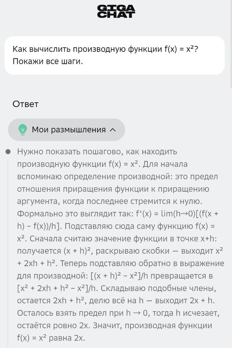 Решаем математические задачки легко — в GigaChat появился режим рассуждений, который объяснит любое задание (запрос) в мельчайших деталях. Для примера взяли промт: «Как вычислить производную функции f(x) = x²? Покажи все шаги». Нейронка не просто даст вопрос-ответ — она начнёт ДУМАТЬ, разбирать задачу поэтапно и чётко пояснять каждый шаг. При этом актуальную инфу будет брать из инета. Фича уже работает в веб-версии. Чтобы затестить, нужно выбрать модель Max R.