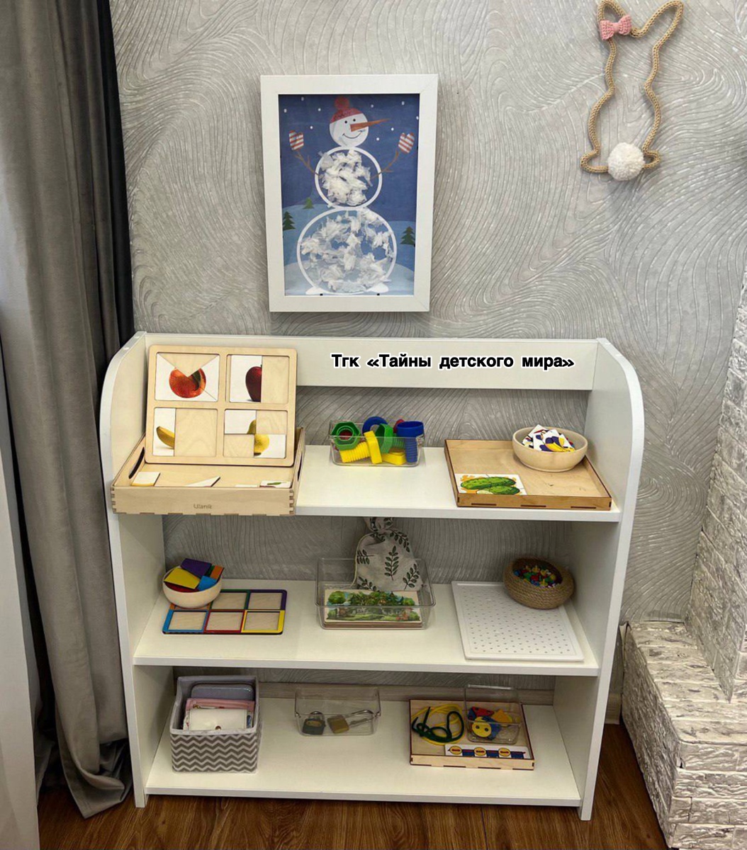 Или о том, как организовать хранение игрушек чтобы ребенок мог не только сам играть, но и убирать игрушки на место. Принципы , на которые мы опираемся при создании этой зоны: ▫️Открытое хранение Размещаем игрушки на открытых полках, на уровне глаз ребёнка. Так ребёнок может видеть все что есть у него в доступе , а после игры - легко возвращать все на свое место. ▫️Ограниченность выбора Не предлагайте ребенку слишком много вариантов одновременно. Это может привести к перегрузке информацией и снижению концентрации. В доступе не больше 10 занятий. Периодически проводим ротацию , о ней писала здесь ▫️Упорядоченность Каждая игрушка должна иметь свое определенное место. Это помогает ребенку научиться порядку и учит его ответственному отношению к вещам. ▫️Простота ухода Легкость уборки — важный фактор. Чем проще ребенку будет убрать игрушки после игры, тем больше шансов, что он будет это делать самостоятельно. Поэтому выставляем весь материал на подносах , а контейнеры стараемся мини
