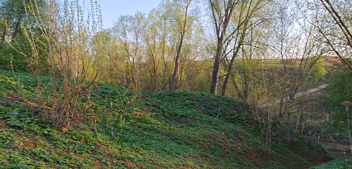 Всем привет. День очень интересный, в смысле поиска. Не хотел сюда ехать, но что-то прям заставило! Думаю, раз так сильно тянет - нужно смотреть. Локация - небольшая татарская деревенька, которая разделена небольшой речкой на две части. Одна, более-менее жилая, а вот вторая... Все дома под снос. Хм... Свернул на маленькую улочку: Все склоны пока не заросли. В этом прелесть, потому как растет здесь исключительно борщевик. Там, где красная линия - русло ключа или родника. Его уж нет давно: Но с этого места я и решил начать... Работаем металлоискателем Дельта 100. Одной из первых находок был трак: Приятна находка - компактная и весовая. Самое приятное то, что место не копано соратниками: Еще один трак попался и куча мелкого, но весового железа: А потом я, неожиданно наткнулся на остатки строения из природного камня: Я очень люблю такие места. Там стабильно попадается, если не "старина", то железо - точно. В этот раз место тоже не подвело: Немного жил/быта и хорошие такие запчасти от с/х т