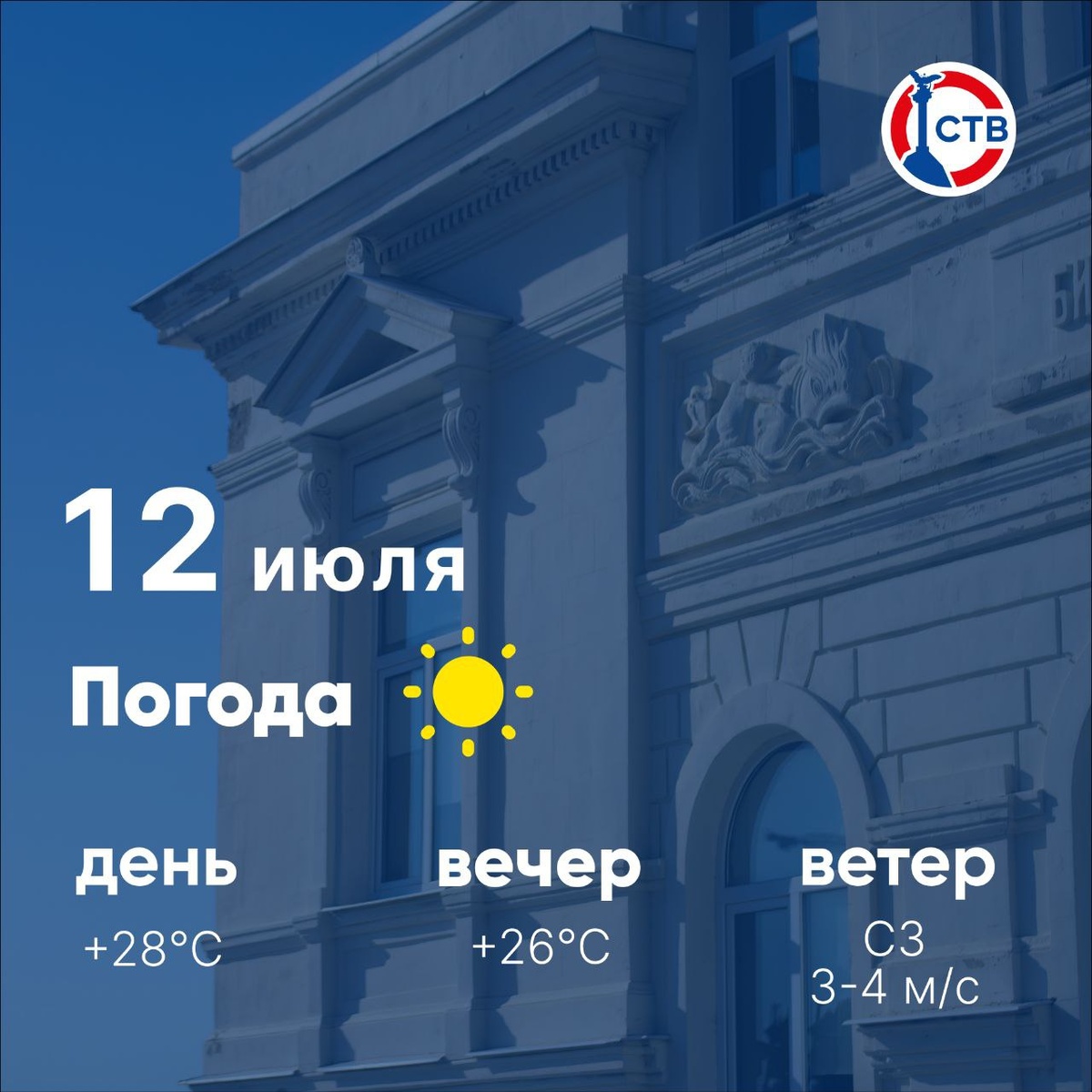 ☀️ Доброе утро, севастопольцы! Сегодня, 12 июля, в городе ясно. Море зовёт — температура воды уже +25°. Всем солнечного настроения и отличного дня! 📺 Подписывайтесь на СТВ