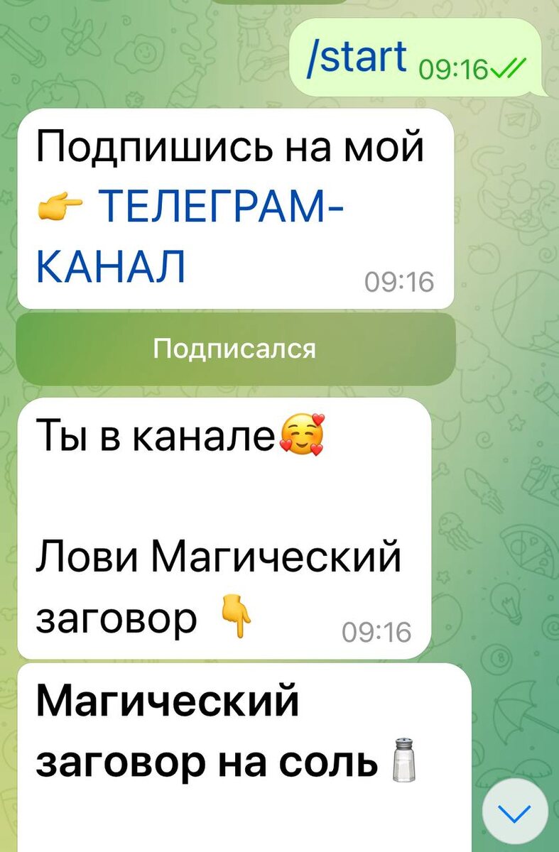 Всем отлично времени суток! Очень многие не нашли заговор на соль, его можно забрать по ссылке 👇👇👇 https://t.me/Predskazaniya_Rikas_bot?domain=Predskazaniya_Rikas_bot&start=ml23-3380