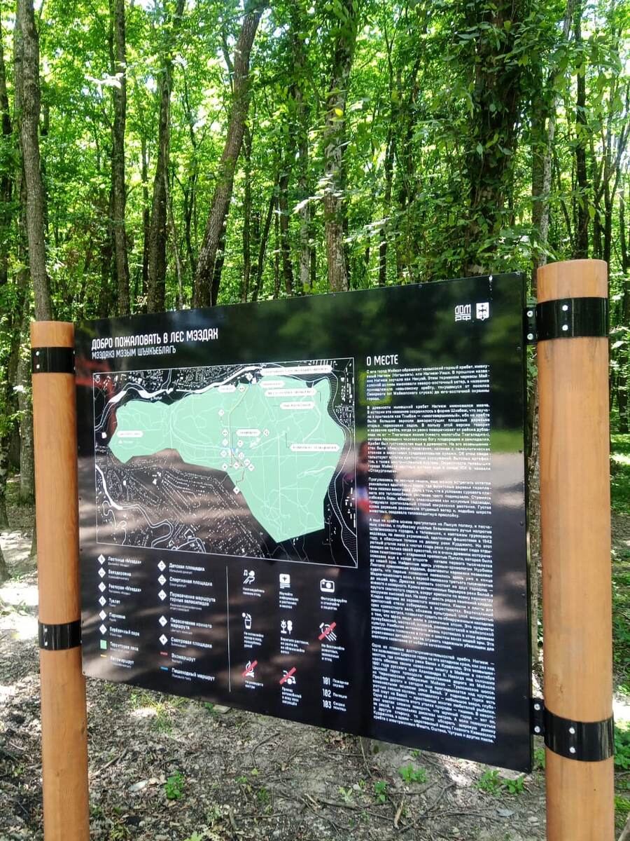 Название в переводе с адыгейского означает «прекрасный лес». В 2024 году в рамках проекта по благоустройству зоны обустроили покрытие пешеходных и велодорожек, установили малые архитектурные формы, детскую и спортивную площадки, провели озеленение, смонтировали уличное освещение, камеры видеонаблюдения и аудиосистемы. Сперва пойдем от парковки направо, по деревянной Экотропе. Очень удобно идти по деревянному настилу. Местами есть лавочки для отдыха. Экотропа заканчивается смотровой площадкой. Хорошо виден один из районов Майкопа. Дальше выходим на ответвление от экотропы. И тут есть еще одна смотровая площадка. Дальше спускаемся вниз, к детской площадке.