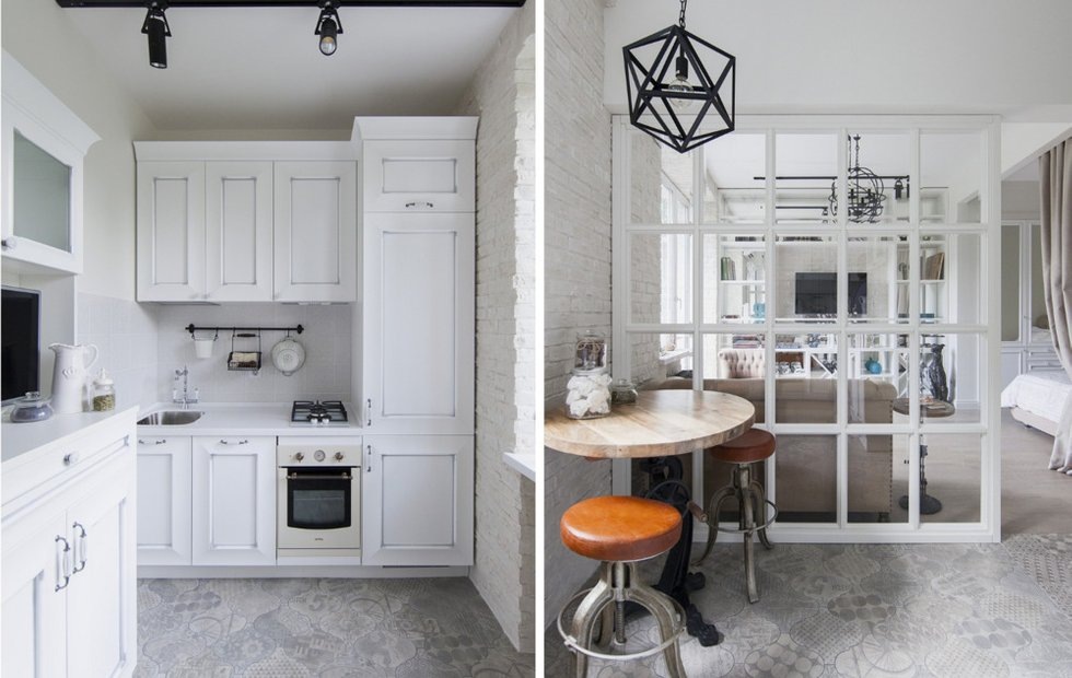 Крохотная однушка в стиле лофт Место: Москва, район нагатинский затон Тип дома: Кирпичный дом Метраж: 32 кв. м Комнаты: 1 Дизайн: Мария Дадиани Фото: Юрий Гришко Владелец этой маленькой квартиры в старом доме – холостяк. Однако он хотел оформить не минималистичный интерьер, а более уютный и жилой лофт с удобной планировкой и продуманными системами хранения. Дизайнера Марию Дадиани не испугали, а наоборот, вдохновили поставленные задачи – результат порадовал всех. Если раньше при входе в квартиру гости попадали в тесную прихожую, где нельзя было развернуться, то сейчас она светлая и просторная, с большими системами хранения. Стену между кухней и комнатой демонтировали: проблему зонирования решили с помощью перегородки со стеклянными окошками. Жилое пространство разделили на спальню в нише и гостиную. В санузле ванну заменили на душевую, чтобы выиграть несколько дополнительных метров. В отделке сделали ставку на доступные материалы: на пол положили ламинат и недорогую керамическую плитку
