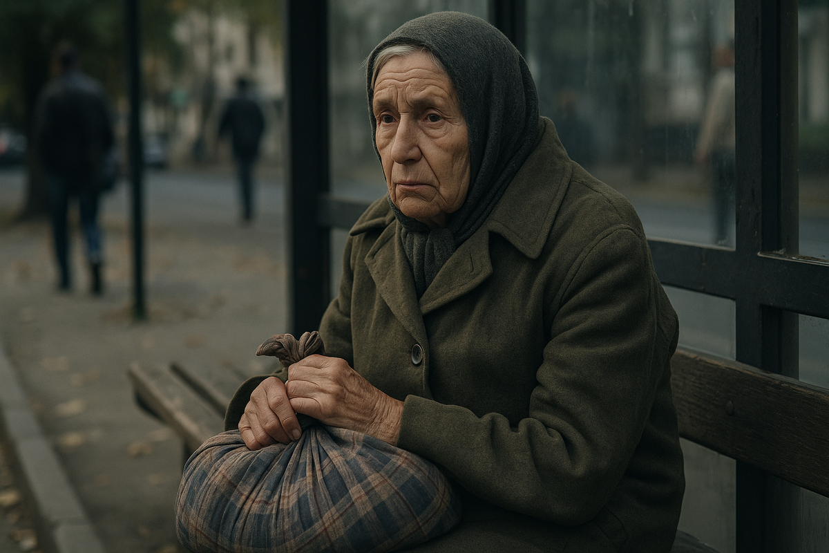 На старенькой лавочке возле автобусной остановки сидела женщина в поношенном пальто. Сгорбленная, с потухшим взглядом, она держала в руках узел с вещами. Прохожие проходили мимо, не замечая её. Только один мальчишка остановился и посмотрел на неё с жалостью: