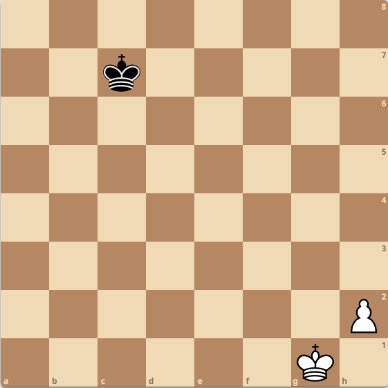 В уроках №6 и №8 я объяснял как провести пешку в ферзи. Но есть особенный случай - это если на доске остались король с крайней пешкой (пешка на вертикали а или h) против одинокого короля. Выиграть в такой позиции гораздо сложнее. Чтобы слабой стороне сделать ничью черному королю необходимо всего лишь встать в угол, где находится клетка превращений, в данной позиции на h8. Если король успел в угол, то сильнейшая сторона не сможет его оттуда выгнать. Ход пешкой на h7 приводит к пату. На ходы белым королём черные должны не отходить от угла - вышел из угла, вошёл в угол. Каждый второй ход должен быть в угол. И тогда либо белые двинут пешку вперед и будет пат, либо ничья будет вследствие троекратного повторения позиции. Самое интересное, что если белым добавить слона, то всё будет зависеть по клеткам какого цвета он ходит. Для победы он должен ходить по клеткам того же цвета, что и клетка превращений. Это нужно для того, чтобы можно было поставить шах королю и не пустить его обратно. А если