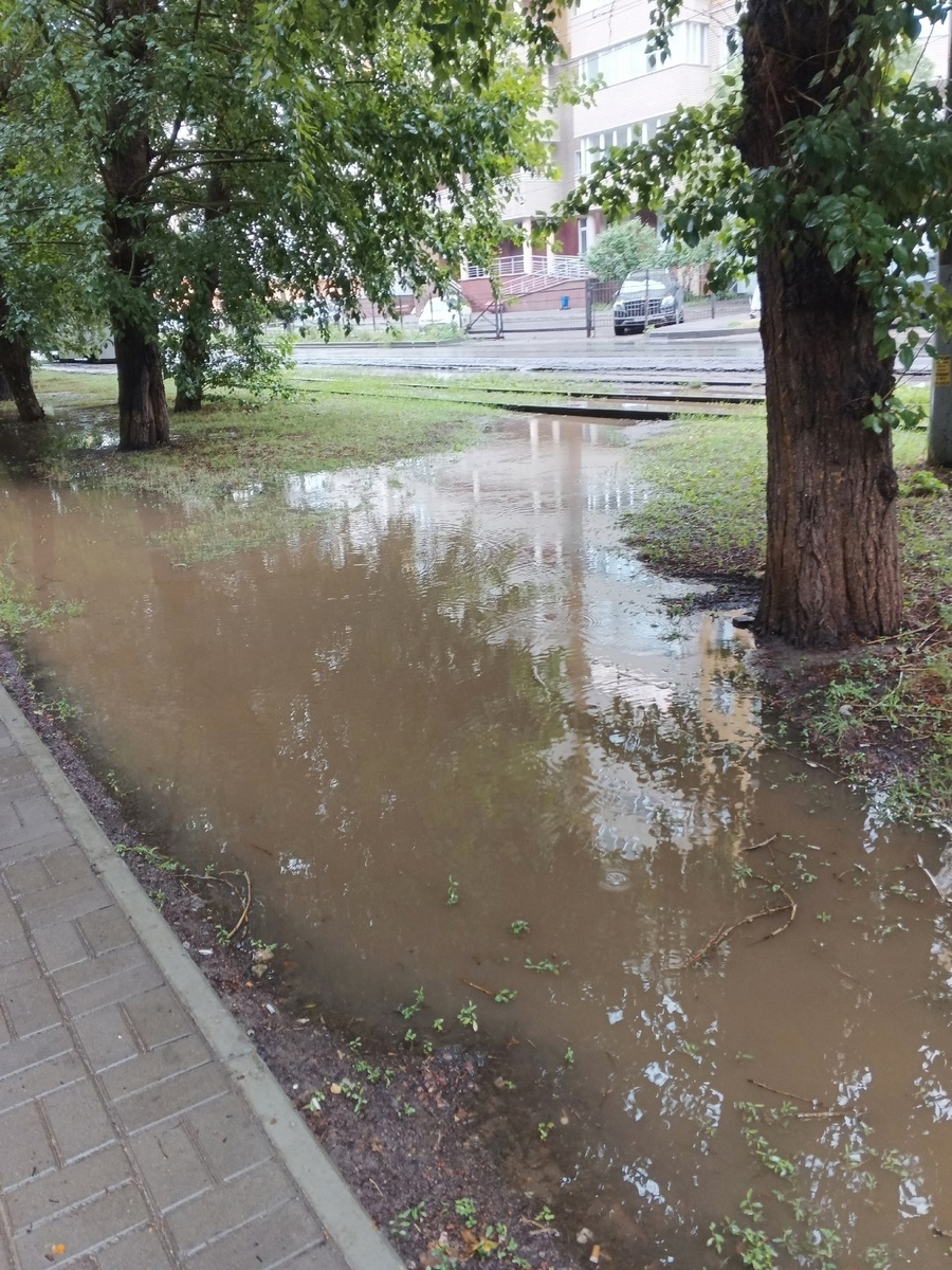 Но сначала покажу погодные условия. Как говорится - деревню Гадюкино смыло) В сквере чуть суше: По этой замечательной погоде я плавала по красочным магазинам. Нашей краски там не оказалось, поэтому будем ждать с ВБ. Пока вторую банку для потолка я не привезла, муж покрасил печь первым слоем: И внезапно разобрал трюмо. О чём мы с ним не договаривались. Правда стояло оно не удобно - проход к нужному шкафу был очень узким. Поэтому муж расчленил трюмо на две части - зеркало повесил на стену, а тумбу решил покрасить и потом "куда хочешь". Дообдирал старый лак (там мало уже было), покрасил в белый, а ножки коричневым. Это тоже первый слой. Теперь я буду думать - куда её. Или наверх, тогда надо под ту тумбу и стул красить эту штуку в шоколадный. Или как-то разместить в большой комнате, тогда цвет нужен песочный, под мебельную стенку. Но я была к этому решению вообще не готова) Внезапненькое... Дождь шёл шёл и шёл и сосед, привезший себе щебёнку, застрял на въезде в участок. До вечера так и не