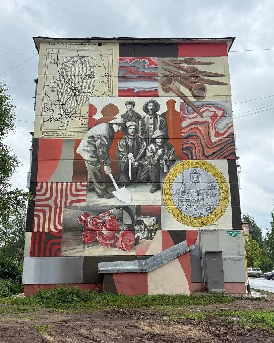 🎨В Соликамске готов ещё один мурал Художник Сергей Акрамов завершил свою работу на ул. Матросова, 61. Фасад посвящён истории добычи калийных солей. Центральным изображением служит фрагмент архивного фото 1927 г. «Первые проходчики шахтных стволов». Сверху - карта местонахождения калийных солей в прикамском районе Н. А. Шалуна. Внизу юбилейная монета 2011 г. из серии «Древние города России» с изображениями панорамы города и исторического ансамбля. Источник: Фестиваль монументальной живописи СОЛИКАМСК АРТ