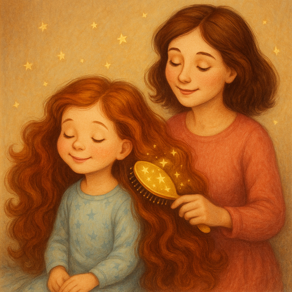 — Давным-давно жила маленькая звёздочка. Она мечтала спуститься на землю и стать волосинкой. Самой красивой, самой мягкой. И вот однажды её мечта сбылась — она стала частью твоих волос. Да-да, твоих! Каждый волосок на твоей голове когда-то был звёздочкой, — шептала расчёска. — Но чтобы они сияли, им нужно немного заботы. Ласка. Терпение. И любовь.