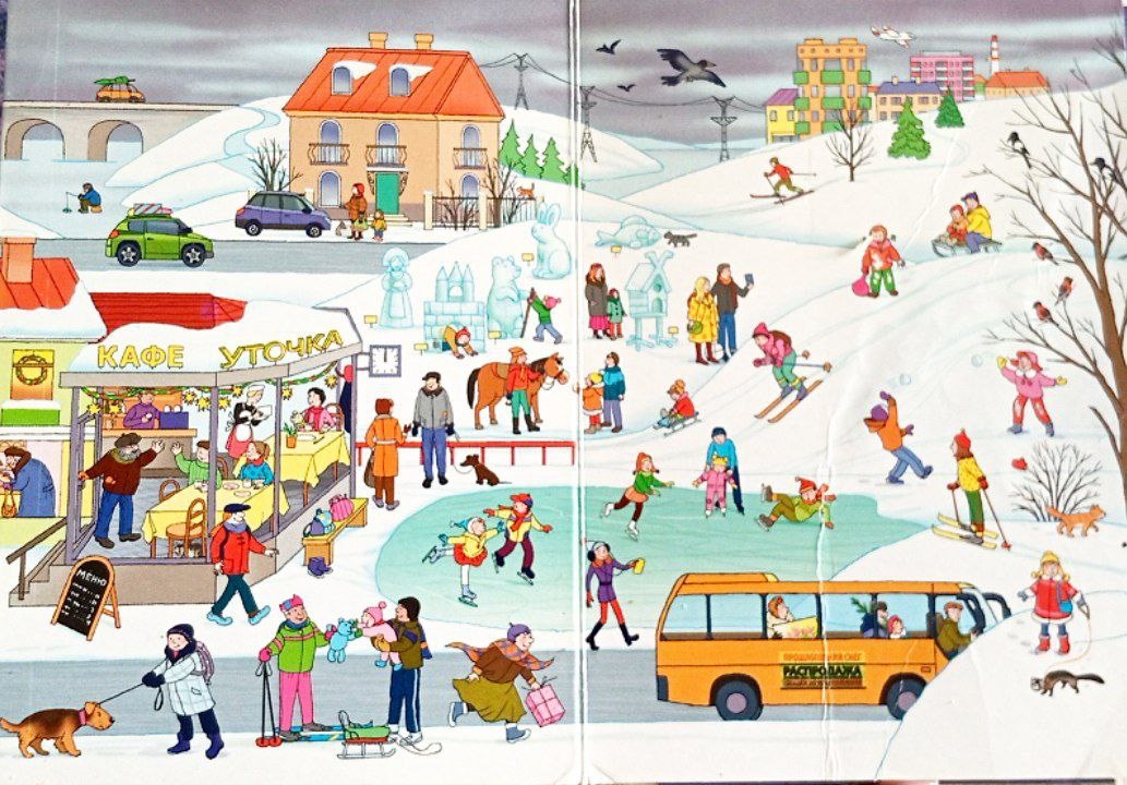 Посмотрите на картинку и ответьте на вопрос: "Кто потерял красную варежку?". Найдите трёх котов.