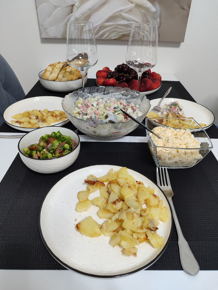 После того, как я забрала подшитые брючки и вернулась домой, мы с Настей стали готовить ужин и ждать Наташу. Старшая дочь попросила пожарить картошку и сделать салат. Этим занималась Настя. А я делала ещё один салатик-намазку – из четырёх отварных яиц, кусочка твердого сыра, пару крупных зубчиков чеснока, майонезного соуса с щепотками соли и перца. Порезала копчёную сельдь, украсила её зелёным лучком. Нарезала чесночные багеты. Сервировала стол. У младшей дочери посуды минимум – она у нас вообще по жизни минималистка – поэтому сервировка получается не совсем такой, какую я хотела бы) Наташа привезла фрукты – инжирные персики, отборную черешню и клубнику. И два алкогольных напитка – игристое вино Cava Blanca Blanco Brut и напиток десертный Ligare Aperitivo Spritz, смешав которые мы получили коктейль Апероль шприц 👇 Коктейль мне понравился, приятный на вкус. Посидели мы очень хорошо. За это время успели наговориться, повспоминать семейные моменты, договориться о сегодняшней совместной