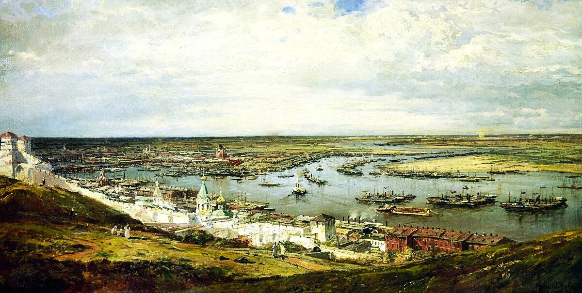 - Место, где расположен Нижний, — красивейшее из всех виденных мною в России; здесь уже не просто низкие утесы, приземистым валом тянущиеся вдоль берега великой реки, не просто волнообразные складки местности посреди обширной равнины, именуемые холмами; здесь целая гора, настоящая гора, образующая мыс у слияния Волги и Оки — двух равно полноводных рек, ибо в устье своем Ока кажется столь же широкою, что и Волга, и название свое она утрачивает здесь лишь оттого, что течет не так издалека. Нижегородский верхний город, построенный на этой горе, возвышается над необъятною, словно море, равниной; у подножия этого мыса открывается целый бескрайний мир, по соседству же с ним устраивается крупнейшая в мире ярмарка; ежегодно в течение шести недель у слияния Волги и Оки встречаются купцы обеих богатейших частей света. Место это поистине картинно; до сей поры в России я любовался подлинно живописными видами лишь на московских улицах да вдоль петербургских набережных, но те ландшафты были созданы человеком; здесь же прекрасна сама природа...