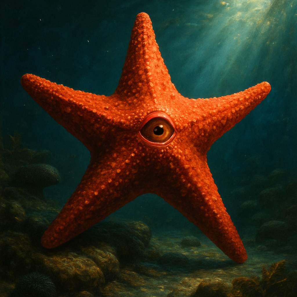 Я не поверил, когда услышал это впервые. Без глаз — но видят. Ну как такое возможно? Я думал, это шутка. Может, ошибка перевода? Или какой-то поэтический образ. Но нет. Учёные всерьёз заявляют: есть существа, которые не имеют глаз, но как-то умудряются определять, где вы находитесь. Точно. Быстро. И без промаха. Меня это до сих пор пугает. Знакомьтесь: морская звезда Patiria miniata. Маленькая, как ладонь. Красная или фиолетовая, с лучами, как у мультяшной игрушки. Никаких глаз у неё нет. Ни спереди, ни сбоку, ни внутри. Ни сетчатки, ни зрачка, ни хоть какого-нибудь намёка на зрение. И вот она лежит себе в аквариуме, как всегда, не двигается. А учёные закрывают часть стекла картоном — делают тень. И что вы думаете? Она — медленно, как будто лениво, но уверенно — ползёт именно туда, где тень. Где укрытие. Где меньше света. И делает это вновь и вновь. Безошибочно. На её коже — тысячи крошечных светочувствительных клеток. Прямо на щупальцах, по краям. Эти клетки улавливают свет, направл