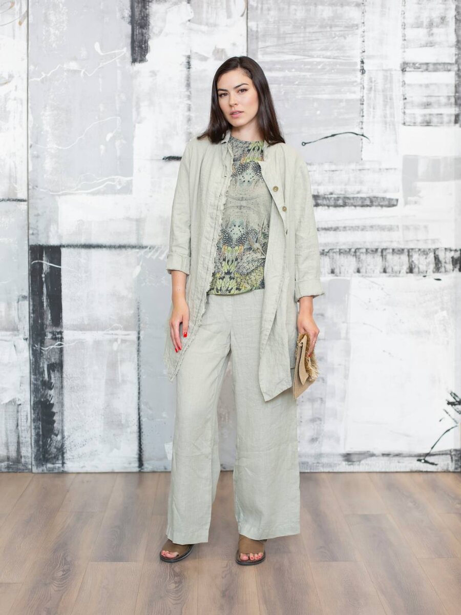 Образ от GRIZAS — идеальное воплощение натуральной эстетики и современного бохо-стиля. Лёгкая блуза из тонкого льна с абстрактным графичным принтом в зелёных тонах придаёт образу художественную выразительность. Жакет из необработанного льна в нежном зелёном оттенке подчёркивает натуральную текстуру ткани и добавляет мягкости силуэту. Широкие брюки в тон, выполненные из 100% премиального льна, завершают образ, создавая гармоничный и свободный силуэт. Отличный выбор для летнего ассортимента бутика с акцентом на натуральные ткани и актуальный крой. Для оптового сотрудничества пишите нам: 📲-в директ 📲-по номеру 8 800 511 51 95 📲- +7 495 146-92-72 📲Наш сайт — https://sollery.pro ✉️-на почту info@sollery.fashion