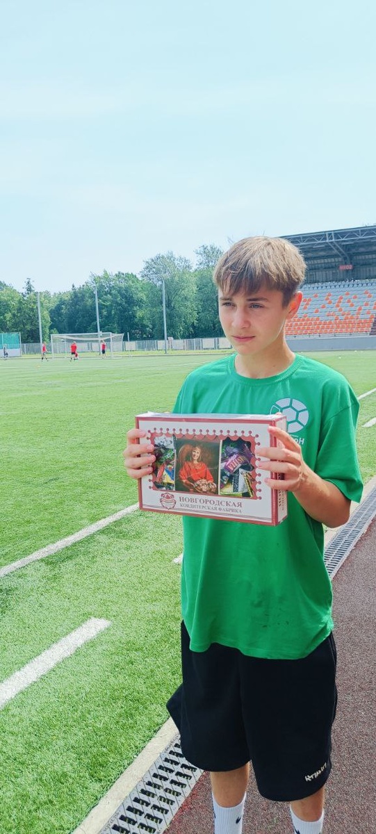 По итогам голосования в телеграм-канале «Сш электрон » лучшим игроком 11 тура «ЮФЛ Северо-Запад» был признан Виктор Артемьев, он получил сладкий подарок 🎁 от Новгородской кондитерской фабрики