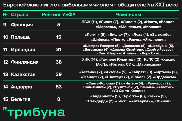Перед тем, как представить «лучшие» чемпионаты, необходимо сделать пару замечаний. Позиции лиг в рейтинге ранжировались по количеству чемпионов, а в случае равенства учитывалось место в рейтинге УЕФА (сезон-2024/25). Также для трех чемпионатов было учтено меньше сезонов. Во-первых, чемпионаты Сербии и Черногории, потому что как независимые высшие дивизионы они были сформированы только в 2006 году. Во-вторых, чемпионат Азербайджана, чьи сезоны-2001/02 и 2002/03 не признаны УЕФА из-за конфликта клубов с федерацией футбола.