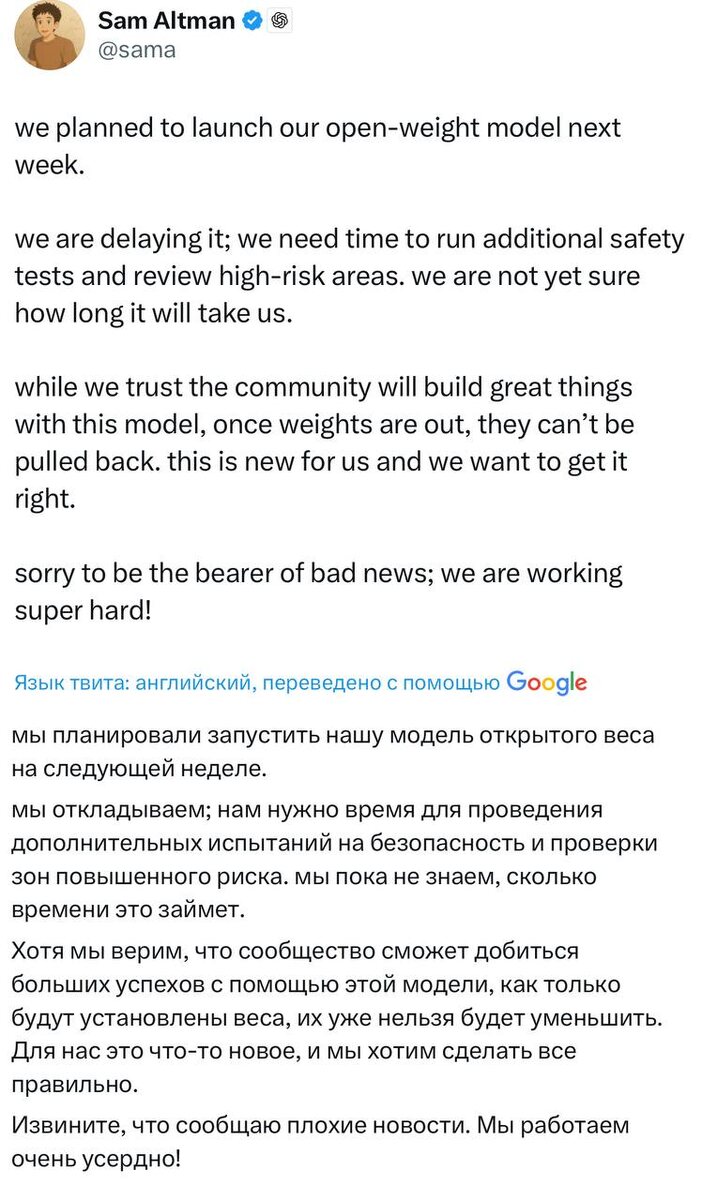 Выходит kimi k2, рвет все бенчмарки И через день откладывается выход новой os модели от OpenAI Грустно конечно, но вопрос интересный связанно ли это https://github.com/MoonshotAI/Kimi-K2 Бенчмарки поражают, отзывы читал, но сам не тестировал - все в восторге