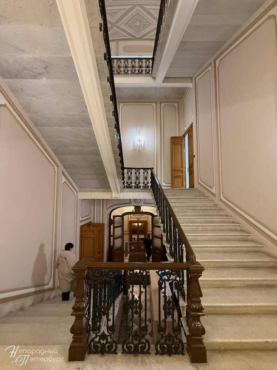 Здесь можно увидеть лестницу с ажурными перилами, камин с зеркалом и часами в окружении декора, а ещё можно рассмотреть лепнину на потолке верхнего этажа.
