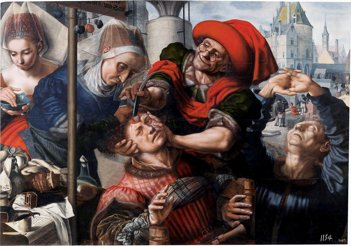 Перед нами картина фламандского художника Яна Сандерса ван Хемессена (1500-1566). На ней изображён так называемый "stone cutter / каменотёс", вымышленный тип хирурга из средневековой легенды. В ней человек по имени Лубберт Дас жаловался, что делает глупости. На что шарлатан убедил его, что источником его глупости является камень (камень безумия) в его голове. И если удалить камень, он перестанет быть глупцом. Эта история была очень популярна в средневековом искусстве, где она использовалась как символ глупости/абсурда/доверчивости. Местом проведения операции на этой картине является город, где-то рядом с каналом. Несчастный плачущий пациент привязан к стулу, а пожилая женщина пытается зафиксировать его голову. Хирург с саркастической улыбкой удаляет камень бритвой. Молодая женщина позади готовит мазь, возможно, для использования после операции. А мужчина справа, вероятно, следующий пациент. Он разминает руки в предвкушении и отчаянии. Люди на этой картине одеты в старомодную для
