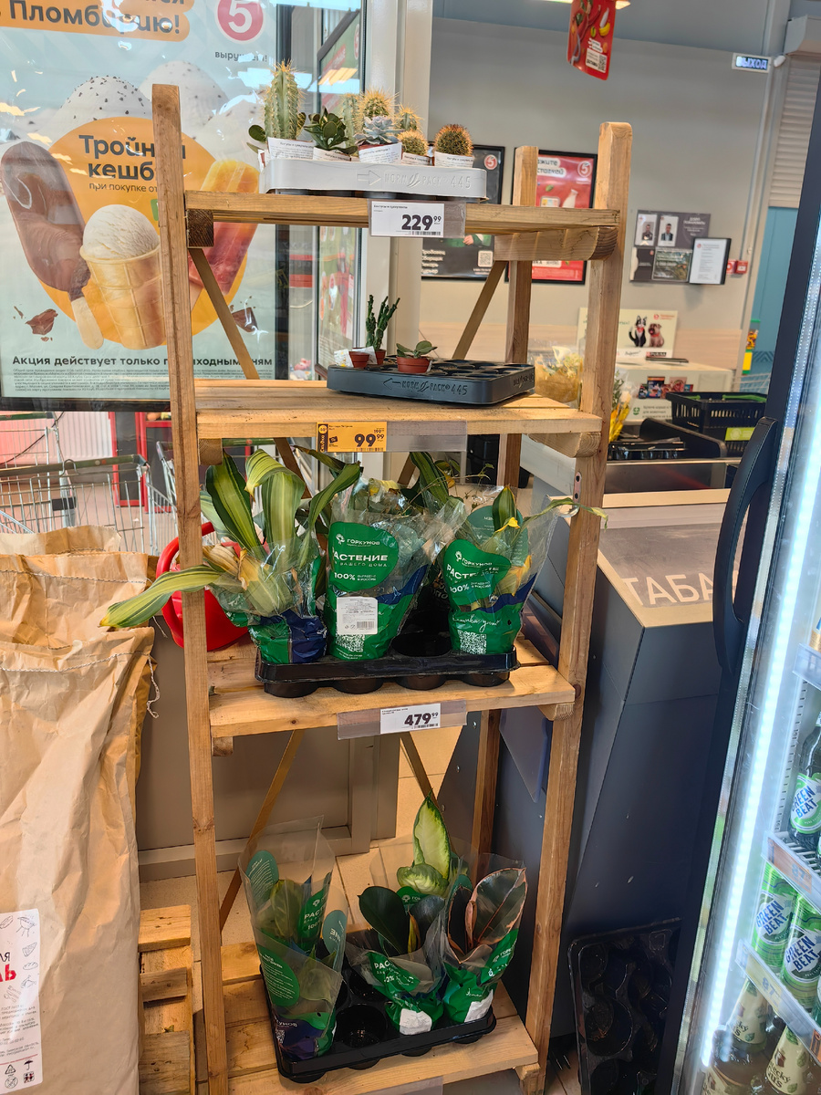Друзья, вчерашний день это прямо цветочный восторг!)))) Мы ездили в Калугу отметить сразу две важные даты, но упустить случай и пошнырять по "злачным" местам я никак не могла)))) Так что в две Пятерочки нос сунула и без цветов уйти не удалось)))) Первой была Пятерочка, в которую я ходила, когда лежала в больнице на реабилитации. Там всегда был интересный ассортимент. В этот раз почти все явно разобрали, но кое-что для меня осталось)) Кстати, попала я в эту Пятерочку только потому, что рядом магазин "Все Инструменты ру", где муж забирал гигантскую коробищу со своим подарочком))) В кактусах и суккулентах мне тут ничего не досталось интересненького. Все три суккулента у меня уже есть. Кактусят покупать не стала. Зато основательно поразглядывала все остальное)) Тут была очень приличная диффенбахия типа Камилла и уже неприличные драцены. Зато я углядела нечто очень любопытное)) Во-первых тут был реальный Фикус Белиз, так что его я цапнула непременно. На его фоне уже совсем очевидно, что у