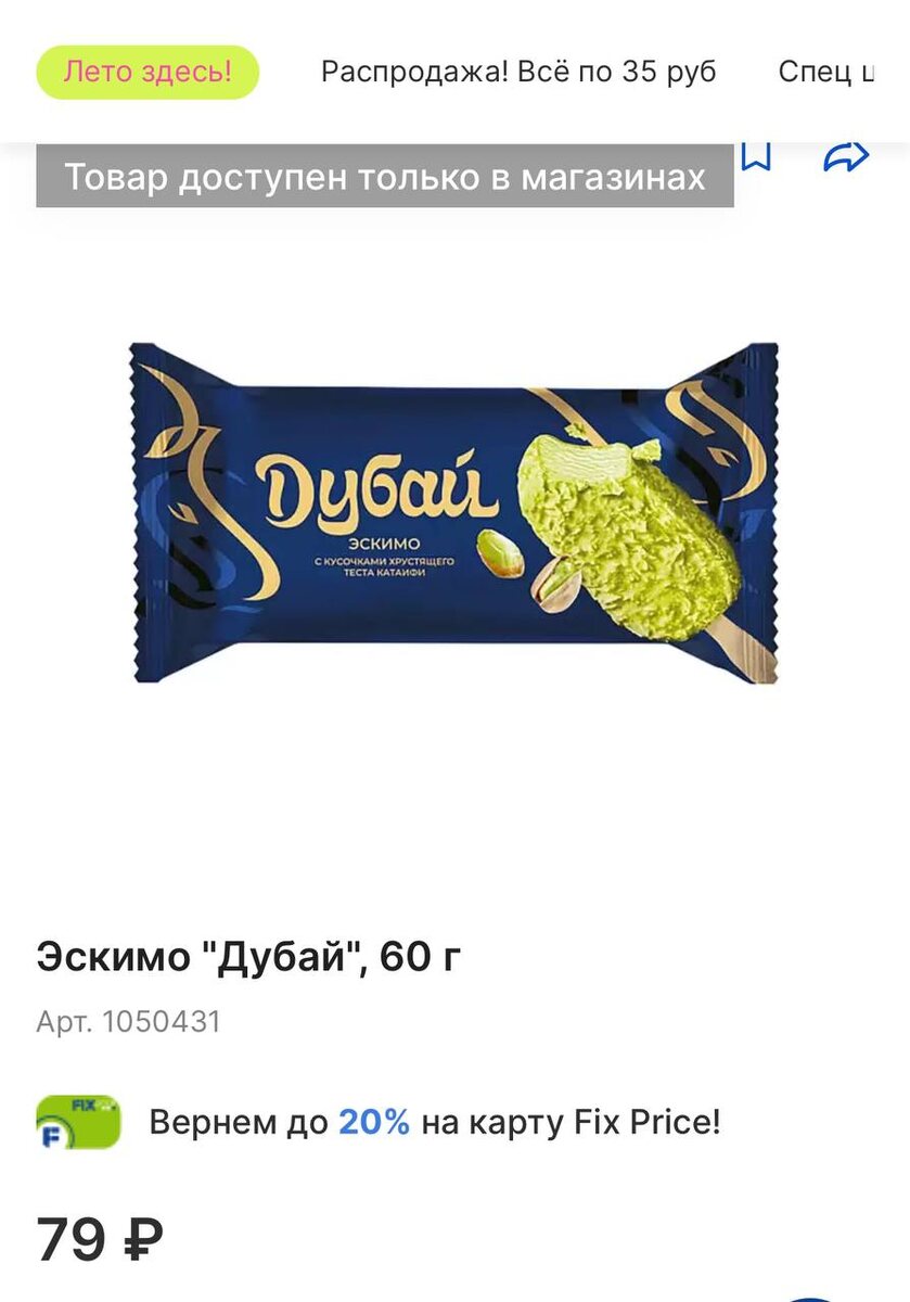 Мороженое со вкусом ДУБАЙСКОГО ШОКОЛАДА завезли в Fix Price — на прилавках уже лежат эскимо «Дубай» и фисташковый стаканчик «Дед Мороз». Самое то в летнее пекло