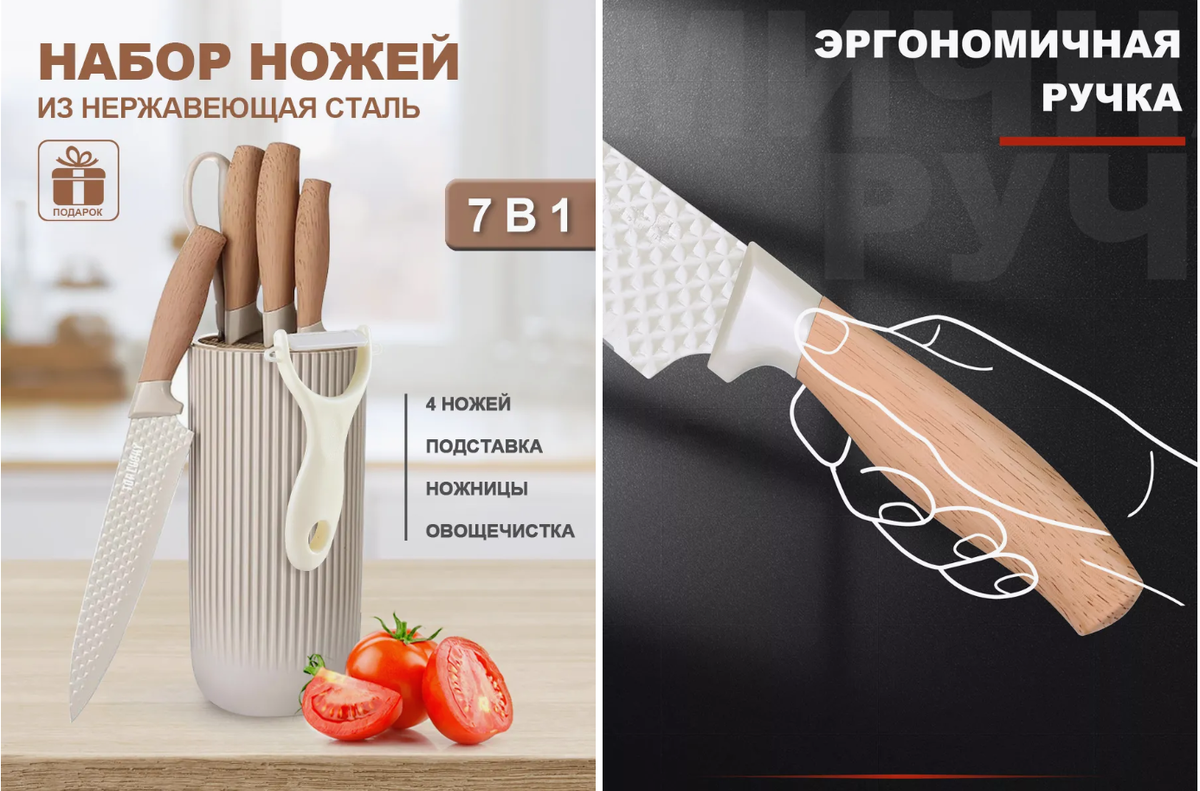 Как же приятно, когда каждая мелочь в доме радует глаз и делает жизнь чуть проще. Будь то острые ножи, красивая салфетница или уютное покрывало — именно такие детали создают атмосферу уюта и заботы. Сегодня я собрала подборку товаров, которые станут не только функциональными помощниками, но и стильными акцентами в интерьере. ⚠️ Важно: статья носит информационный и развлекательный характер. Я делюсь личными находками и впечатлениями. Все мнения субъективны. Практичный и эффектный — этот набор из 7 предметов решает сразу несколько задач. В комплекте: топорик, поварской нож, универсальный, овощечистка, ножницы и подставка. Все лезвия острые и прочные, а ручки из полипропилена удобно ложатся в руку, снижая нагрузку на запястье. Ножи покрыты антипригарным слоем, что облегчает резку и уход. Подходит и для новичков, и для тех, кто давно уверенно чувствует себя на кухне. Отличный подарок для родителей, студентов или молодых семей.