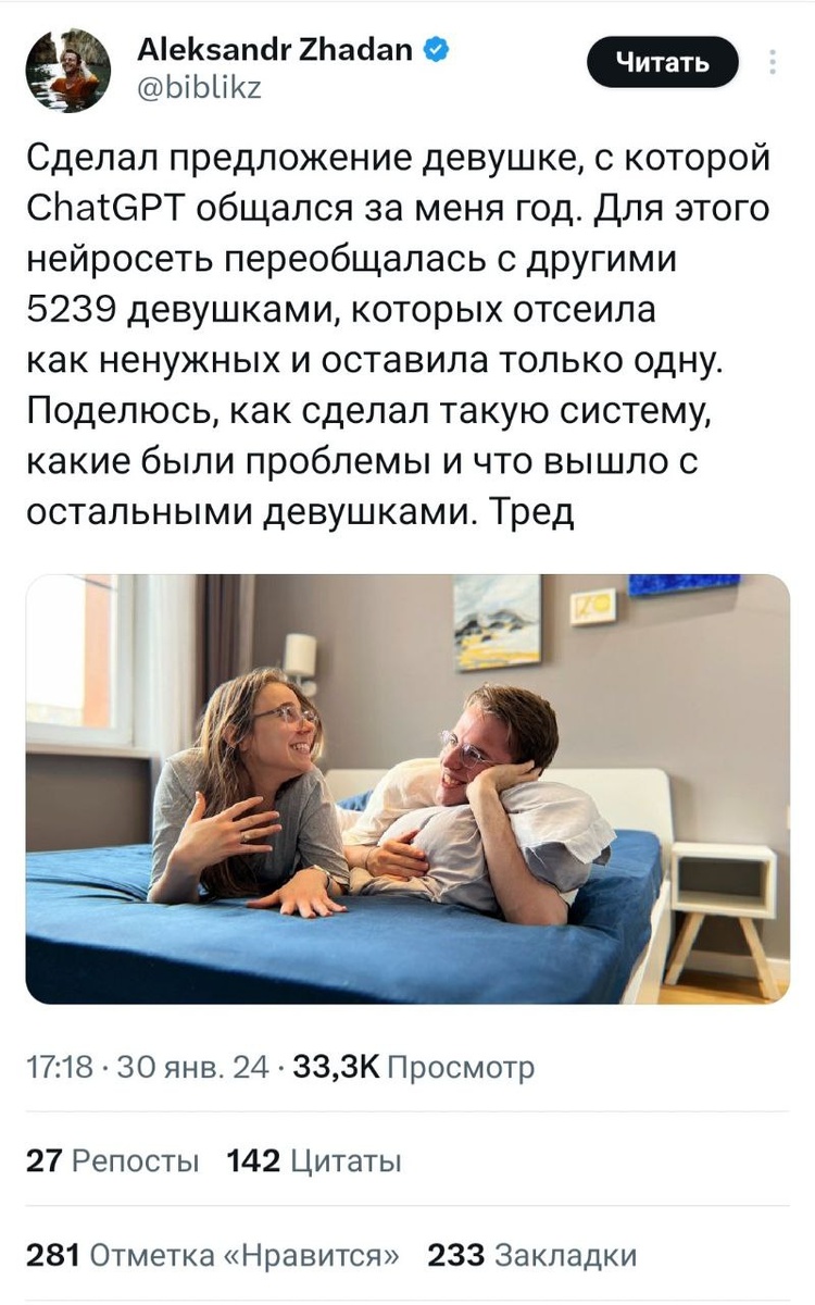 Лол, тот самый студент, который написал диплом при помощи ИИ, выдал гигантский тред о том, как ChatGPT пообщался за него с 5239 (!) девушками и нашёл ту самую, заработав параллельно больше 500 тысяч рублей. Со слов парня, на разработку эпичного проекта ушло 120 часов. Твиттер разделился — одни уже нарекли парня настоящим гением, другие боятся, что человечество оказалось в новом сезоне Чёрного зеркала.