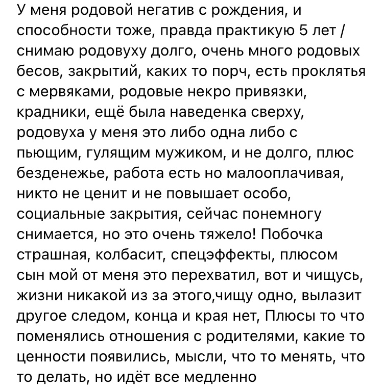 Возрождаю традицию бесплатных диагностик для сложных случаев каждую неделю для одного подписчика моего канала. Подробности здесь Я написала статью о родовом негативе. Под ней появился странный комментарий. Прилагаю скрин. Из этого текста я поняла, что человек практикует пять лет, следовательно, пять лет себя чистит, поэтому ответила, что родовой негатив никто пять лет не снимает. Или у нее не хватает сил на чистку, ну или она постоянно что-то цепляет от клиентов, или ей постоянно делают новые порчи. Но, если бы был второй вариант, то практик в любом случае отличил бы родовой негатив от того, что идет лично ему. На что комментаторша возмутилась) Она оказывается чистит себя всего лишь с ноября 😂 Вы просто представьте себе, у нее много родовых бесов, закрытий, порч, проклятий, мертвяки, родовые некропривязки, крадники, и порчи сверху. То есть сидит человек по уши в дер…ме и берется чистить других людей! Это вообще как?? Вы им чем помочь можете? Вы себе помочь не в состоянии. Чем вы може