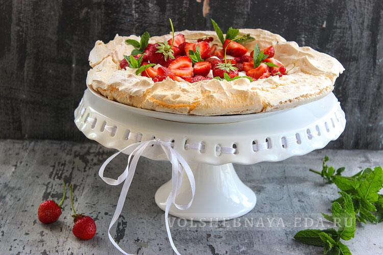 Изысканный десерт, названный в честь знаменитой балерины Анны Павловой. Торт-безе состоит из воздушного белкового коржа, нежного крема и свежих ягод или фруктов. Классический рецепт торт «Павлова» включает приготовление очень воздушного, нежного безе, который хрустящий сверху и мягкий в серединке. Крем, как правило, готовят из взбитых сливок. Ягоды или фрукты, конечно же, можно взять практически любые по сезону, подойдет: клубника, малина, виноград, кусочки фруктов, ежевика, черника и пр. Пекут «Павлову» порционную или в виде большого торта, состоящего з одного или нескольких коржей. Сегодня предлагаю приготовить вместе со мной настоящий торт «Павлова» в домашних условиях, чтобы он получился таким же вкусным и красивым, как в лучших кондитерских. Испечем хрустящий корж-безе и сделаем саму вкусную начинку из клубники и крема из взбитых сливок с мягким сыром. Общее время: 90 минут | Время приготовления: 60 минут Выход: 8 порций | Калорийность: 263.22 кКал на 100 г для безе: для начинки: