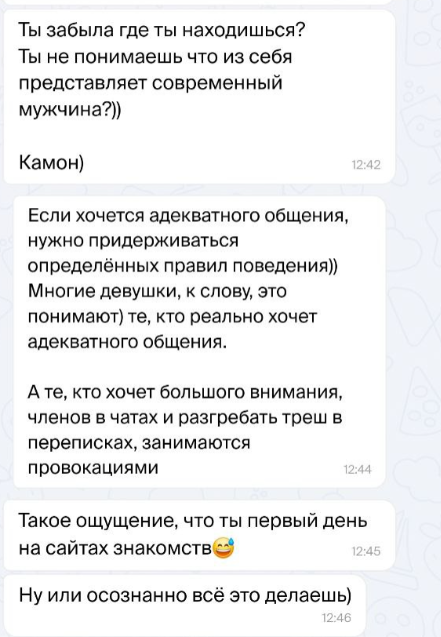 Вопрос, которым задается каждая девушка это "как уберечь себя от убогого свидания?" Способы есть. Нужно внимательно читать то, что пишут вам потенциальные претенденты. 1. Обобщение по типу "не я такой, жизнь такая" Человек демонстрирует вам негативно отрицательное мнение о вашей персоне, о вашей анкете или еще чём-то, но преподносит его как общественное. То есть "не он так думает, а все так думают". Ориентируйтесь на то, что всё, что говорит человек - это его личное мнение и его жизнь. И вам с этим потом жить.... Заметьте, что слова "ты не понимаешь что из себя представляет современный мужчина?" нужно читать как "ты не понимаешь что Я из себя представляю" - и так с любой отсылкой к массам и якобы общественному мнению. 2. Биполярные проявления. Здесь довольно просто. Человек может поливать вас грязью, писать неприятные вещи, а пару дней спустя как ни в чем не бывало написать "привет, спишь?" или "привет, как дела?" Если попробовать найти логику, то ее там нет. Рассмотрим варианты. в