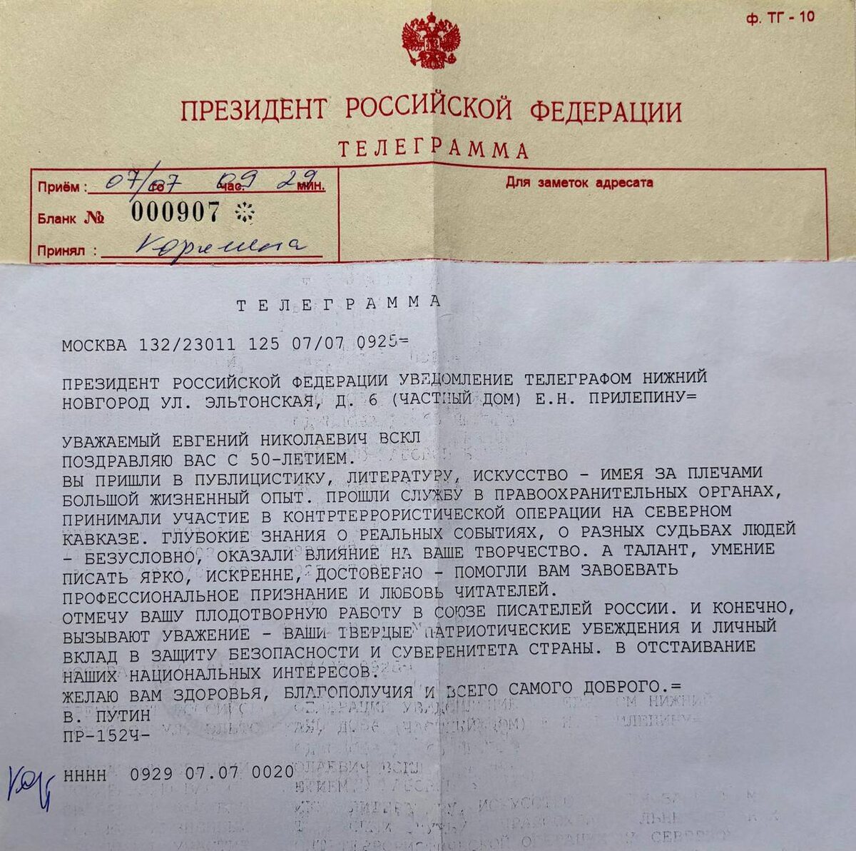 На официальных чествованиях писателя, политика, общественного деятеля, участника СВО Захара Прилепина, проходящих в Москве, передано и зачитано поздравление Президента РФ В.В.Путина: «Президент Российской Федерации. Е. Н. Прилепину Уважаемый Евгений Николаевич! Поздравляю Вас с 50-летием. Вы пришли в публицистику, литературу, искусство – имея за плечами большой жизненный опыт. Прошли службу в правоохранительных органах. Принимали участие в контртеррористической операции на Северном Кавказе. Глубокие знания о реальных событиях, о разных судьбах людей – безусловно, оказали влияние на Ваше творчество. А талант, умение писать ярко, искренне, достоверно – помогли Вам завоевать профессиональное признание и любовь читателей. Отмечу Вашу плодотворную работу в Союзе писателей России. И конечно, вызывают уважение – Ваши твердые патриотические убеждения и личный вклад в защиту безопасности и суверенитета страны. В отстаивание наших национальных интересов. Желаю Вам здоровья, благополучия