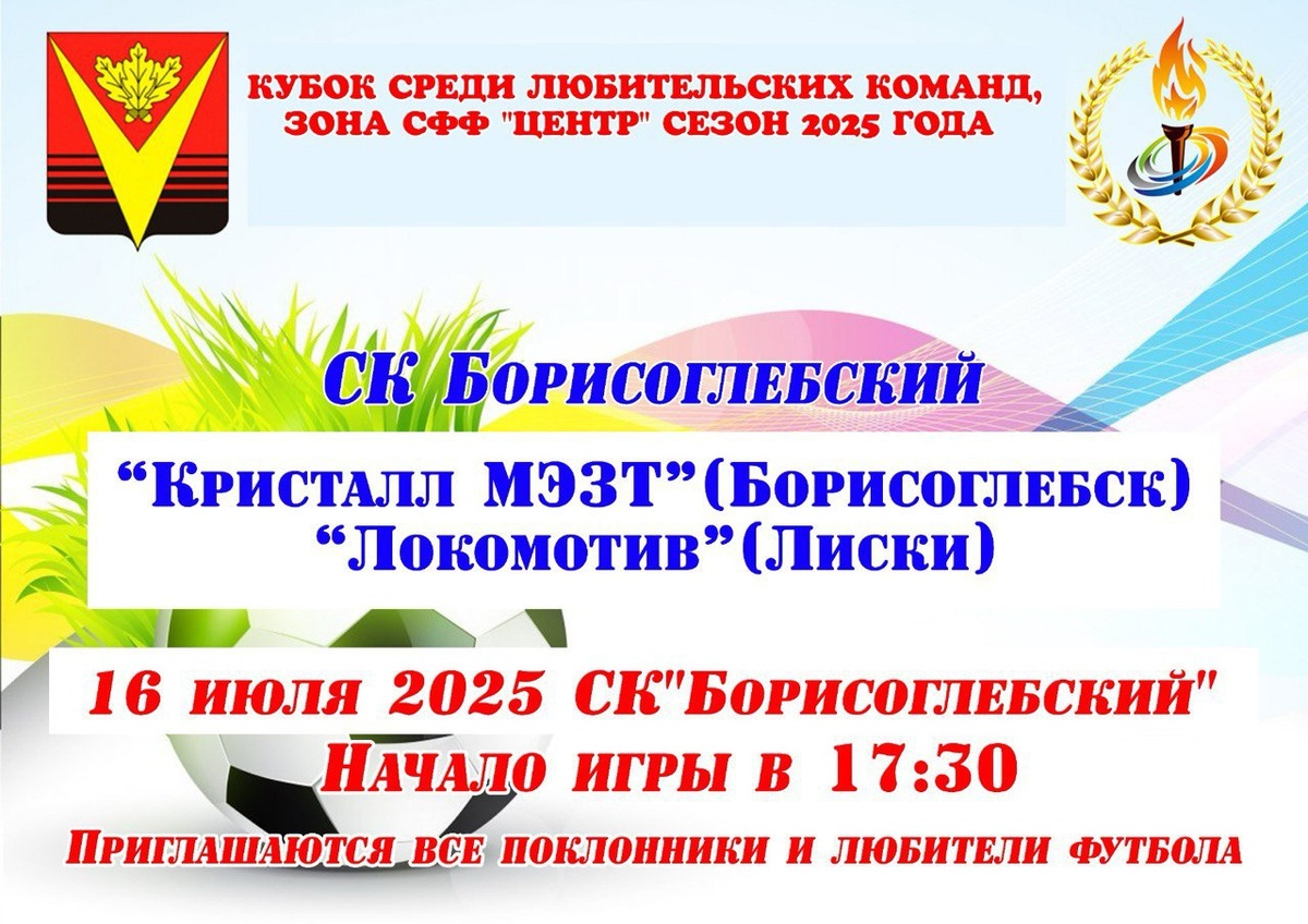 Борисоглебцев и гостей города приглашают стать свидетелями захватывающего футбольного матча между командами «Кристалл МЭЗТ» (Борисоглебск) и «Локомотив» (Лиски), который состоится 16 июля в 17.30 на спортивном комплексе «Борисоглебский». Приходите поболеть за любимую команду и получить заряд бодрости!