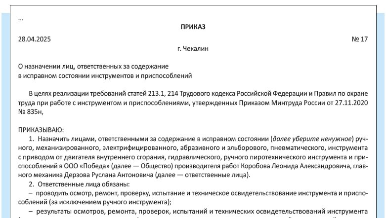 📎 Как назначить ответственного за содержание в исправном состоянии инструмента и приспособлений? Пример приказа