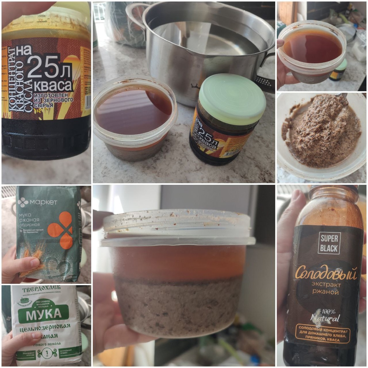 Помните поговорку про того петуха, который клюнуть должен? Вот с квасом к меня всегда так😍🤣 Пока прохладно и думать не думаю по него. А ставить начинаю именно, когда уже жарища! Очевидно, что мгновенно он не получится, но чего ж... Придется подождать пару-тройку дней 🤷🏻♀️ Вода была вскипячена.. (задумалась, есть ли вообще такое слово?) И охлаждена. Из недр холодильника извлекла прошлогоднюю и ПОЗАпрошлогоднюю квасные закваски! Стояли под плотными крышками и ждали. Оценила на вкус и запах. ПОЗАпрошлогодняя понравилась больше! Стояла два года, не открывалась, кисленькая, прозрачная, приятная во всех отношениях. Ну и буквально замутила квас. В воде сначала растворила сахар, потом закваску. Решила на квас пустить забракованную в выпечке ржаную муку "маркет". Для пущей уверенности добавила цз ржаную Твердохлеб. Ливанула туда же квасного сусла и решила немного супер-блэк солодвого экстракта добавить. В кухне сейчас +27. Ожидаю, что за пару дней будет готов. Теперь о пр