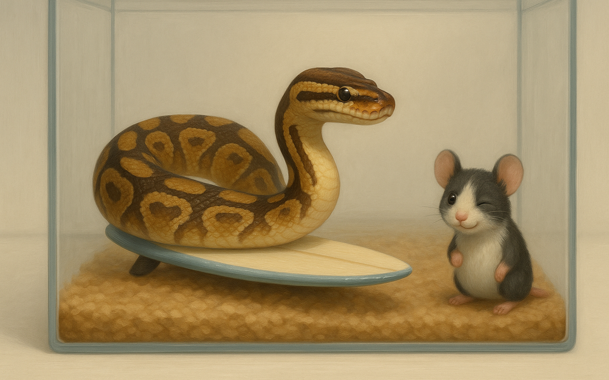 Представьте: вы подходите к террариуму, а ваша королевская питон с упорством альпиниста карабкается по стеклянной стенке. Забавно? 😄 Безусловно. Полезно? Вряд ли. В этой статье вы узнаете, как отличить нормальное исследование от тревожной стереотипии и что нужно сделать, чтобы ваш питомец вновь почувствовал себя как на воле. Glass surfing – когда питон активно передвигается вдоль стенок из стекла или акрила, словно пытаясь преодолеть невидимый барьер или взобраться повыше. На первый взгляд выглядит как тренировка: мышцы в тонусе, настроение на высоте. Но за этим «шоу» может скрываться дискомфорт. Повторение одних и тех же движений десятки раз — классический признак стресса. Иногда «серфинг» — просто любопытство. Рептилия проверяет вертикальные поверхности, получает физическую стимуляцию. Эпизодически, без напряжения и «крика о помощи». Если вы распознаёте хотя бы три пункта — пора действовать. Установите коряги, ветви и полки разной высоты — пусть змея «серфит» в безопасном контексте