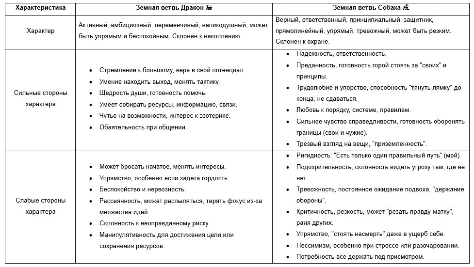 Их столкновение в Бацзы – это конфликт между безграничным потенциалом (辰) и неприступной крепостью (戌). Гармония возможна, если Дракон научится строить, а Собака – доверять миру за стенами.