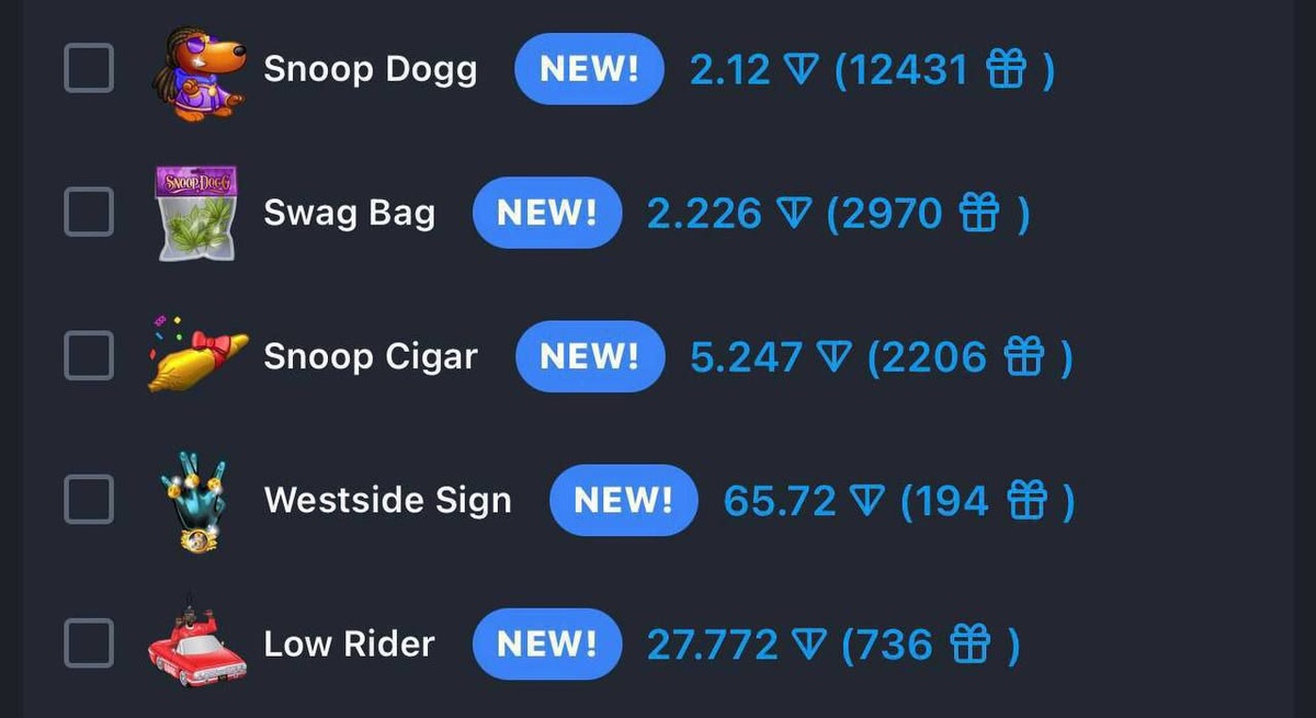 Что у нас по новой коллекции от Снуп Дог На премаркете👉👉 tonnel Дорогие подарки торгуются в ноль. Зато собаки очень хорошо себя показывают . Если выходят подарки с большим саплаем это потенциальные 2-3 x . Ведь покупателей с 3 Ton будет больше чем с 300 Ton. На mrkt дальше можно делать хороший Профит, ведь комиссии 0% 👉 купил на portals или tonnel продал на mrkt 👍