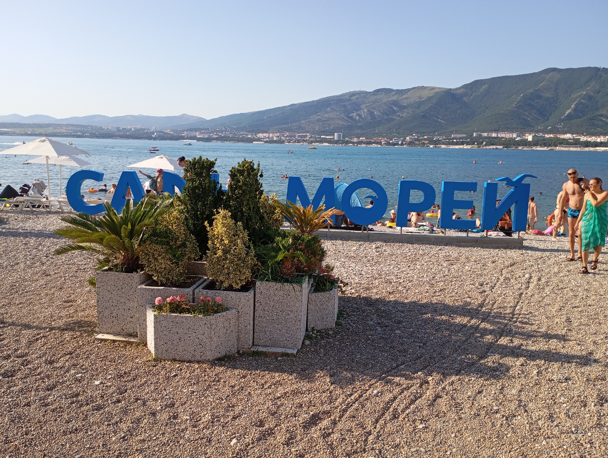 Вообще в принципе в Геленджике есть пляжи на любой вкус, но, что называется, есть нюансы ))) Кому нужен песок - тем ближе к центру, его там насыпали в количестве . По этой же причине море мутное, дальше в нем будут плиты, а главное - полно народа, в том числе маленьких детей. Отдыхать имеют право все, выбирать себе условия для отдыха - тоже. Там, где жила я, на берегу и в море галька, довольно комфортная. В доступе - 5 и 7 минут пешком, - два пляжа - "Сады морей" и пряж пионерского лагеря "Нива". Они вообще похожи, даже один переходит в другой. Что для себя выбирать - дело каждого. Самый большой, самый благоустроенный, самый популярный. Поэтому сюда пойдут все. Вы спрашивали, как тут с народом - вот примерно так. Зонтиков полно, бунгало тоже есть (у меня за спиной), народ со своими ковриками тусуется у захода в воду. Вода чистая, но не сказать, чтобы кристально прозрачная. Такого не бывает на всех городских многолюдных пляжах. Цена на шезлонги и зонтики везде одинаковая, приходит
