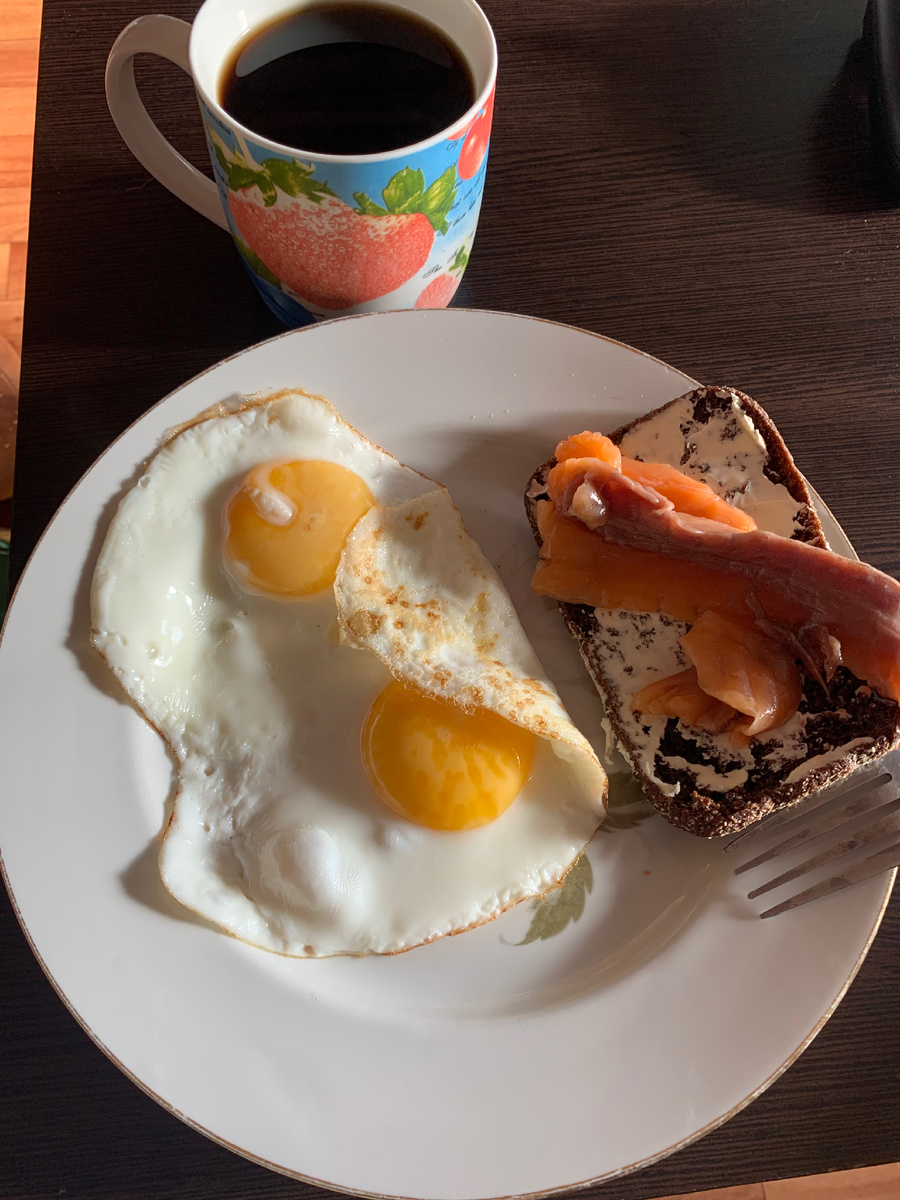 Завтрак мои любимые жаренные яйца и доела ласось.