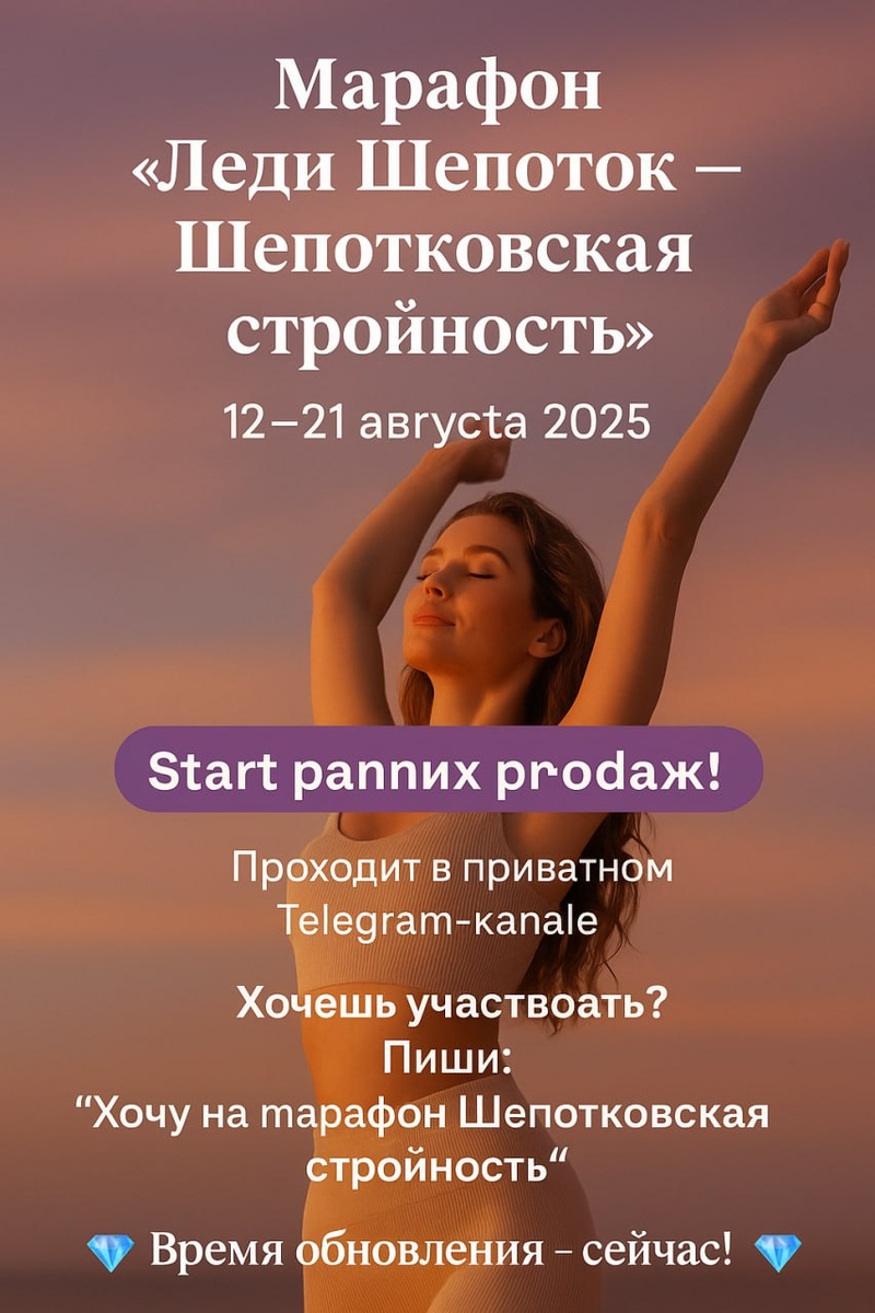 🔥 Ранний старт продаж на марафон "Леди Шепоток – Шепотковская стройность"! 🔥 📆 Даты марафона: 12 – 21 августа 2025 🔮 Вас ждут 34 шепотка и 12 авторских практик, которые помогут раскрыть внутреннюю силу и обновить тело и дух. 💰 Сейчас лучшее время присоединиться! До 15 июня цена за весь марафон всего 930 ₽ — потом будет выше: с 16.06 по 20.06 — 1030 ₽ с 21.06 по 20.07 — 1230 ₽ с 20.07 по 25.07 — 1430 ₽ с 26.07 по 31.07 — 1750 ₽ с 01.08 по 05.08 — 1930 ₽ с 06.08 по 16.08 — 2230 ₽ 📍 Марафон проходит в приватном Telegram-канале Леди Шепоток. 🔗 Хочешь участвовать? Пиши мне в Telegram по ссылке: 👉 https://t.me/OlgaShepotok Сообщение: "Хочу на марафон" ✨ Бонус для Донов из группы ВКонтакте: https://vk.com/ovtueva — скидка 20%! Напиши, что ты Донья, и пришли скрин. Возраст 18+ 💎 Ты — сила. Ты — поток. Время стать стройной в теле и лёгкой в душе. 💎 #ОльгаШепоток #ЛедиШепоток